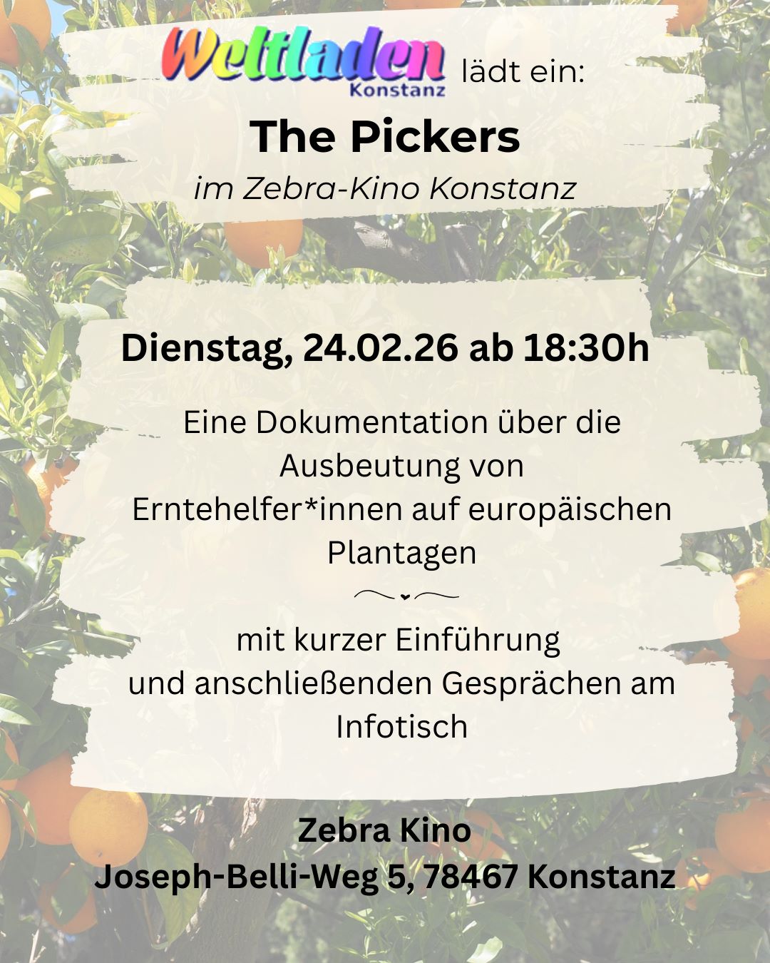 Im Rahmen einer Kooperation zwischen Weltladen und Zebrakino wird am Dienstag 24.02. um 18.30 Uhr die Dokumentation „The Pickers“ gezeigt. Der Film zeichnet die Ausbeutung migrantischer Erntehelfer:innen auf europäischen Plantagen nach: Hinter dem Luxus von Orangen und Erdbeeren in unseren Supermarktregalen verbirgt sich ein skandalöses System der Ausnutzung. In der Dokumentation kommen Menschen aus dem globalen Süden zu Wort, die unter sklavenähnlichen Bedingungen – ohne Strom und Wasser, ohne Arbeitsvertrag und Mindestlohn – in Europa leben und arbeiten. Nach der Filmvorführung lädt der Weltladen am Infotisch zu Gesprächen über unsere Verantwortung als Konsument:innen ein.